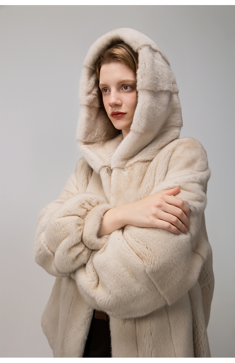 Practical hooded design, balancing functionality and aesthetics. It is not a casual symbol, but a carefully tailored elegant hat with smooth lines that naturally droop when put down to form an elegant neck protection. The hat circumference is ample and does not affect the hairstyle, providing real shelter in cold and light rain weather. ·Advantages: Breaking through the stereotype that fur is limited to formal occasions: integrating practical functions into advanced design, meeting the wearing needs of various weather and scene conditions, interpreting the "low-key wisdom"