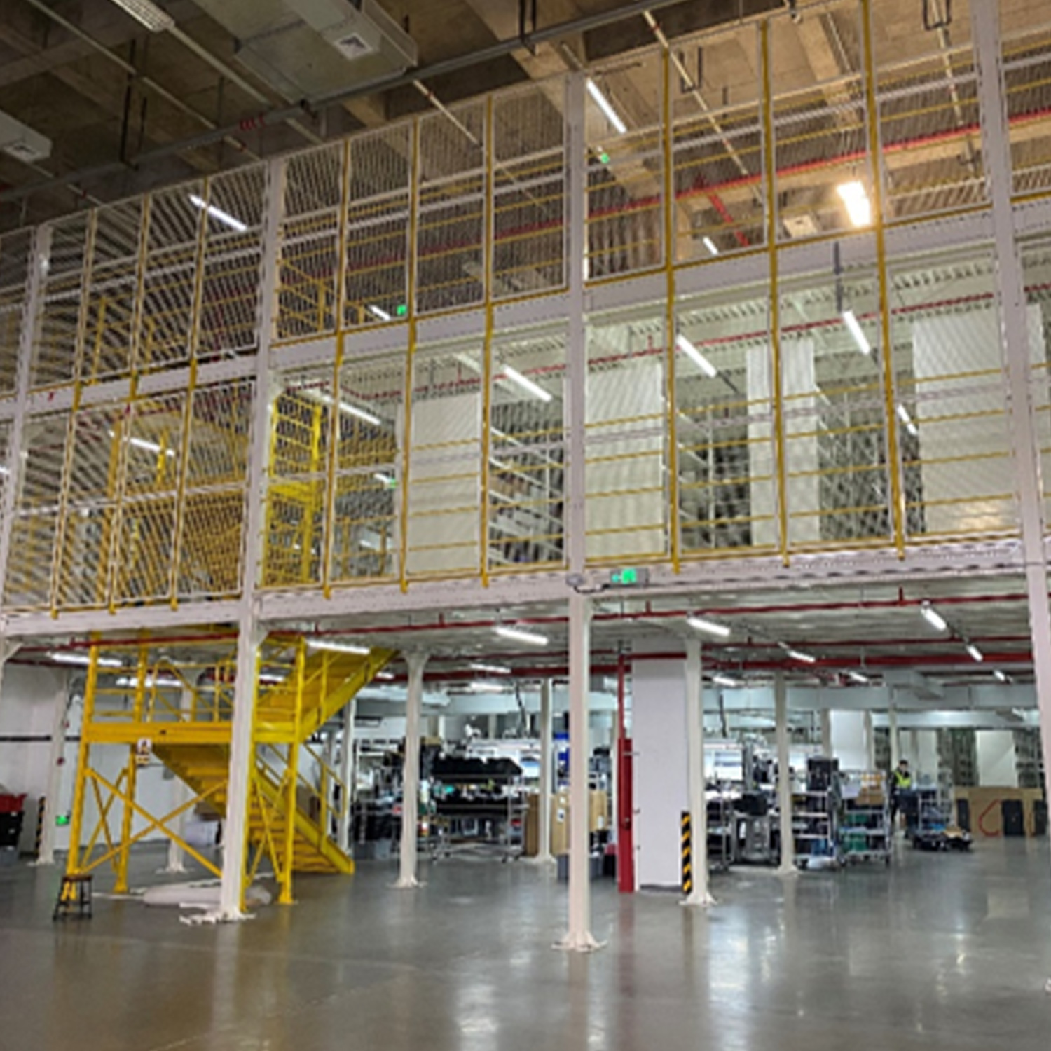 The steel structure platform is an assembled structure. The columns usually use square tubes, round tubes or H-steels. The main and add-on beams are usually H-beams or cold-rolled steel. The floor are usually cold-rolled steel floors. There are ordinary plane type, convex point type, hollow type and so on. The goods are transported to the second and third floors by forklifts, hydraulic lifting platforms or freight elevators, and then transported to the designated locations by trolleys or hydraulic pallet trucks. The steel structure platform enables storage and management to be combined with the shortest distance, and the upstairs or downstairs can be used as warehouse offices.